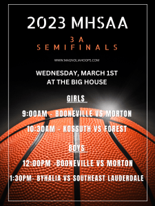 9:00 (G) Region 1 #1 Booneville (28-3) travels 205 miles vs Region 5 #1 Morton (25-3) travels 36 miles